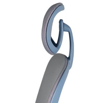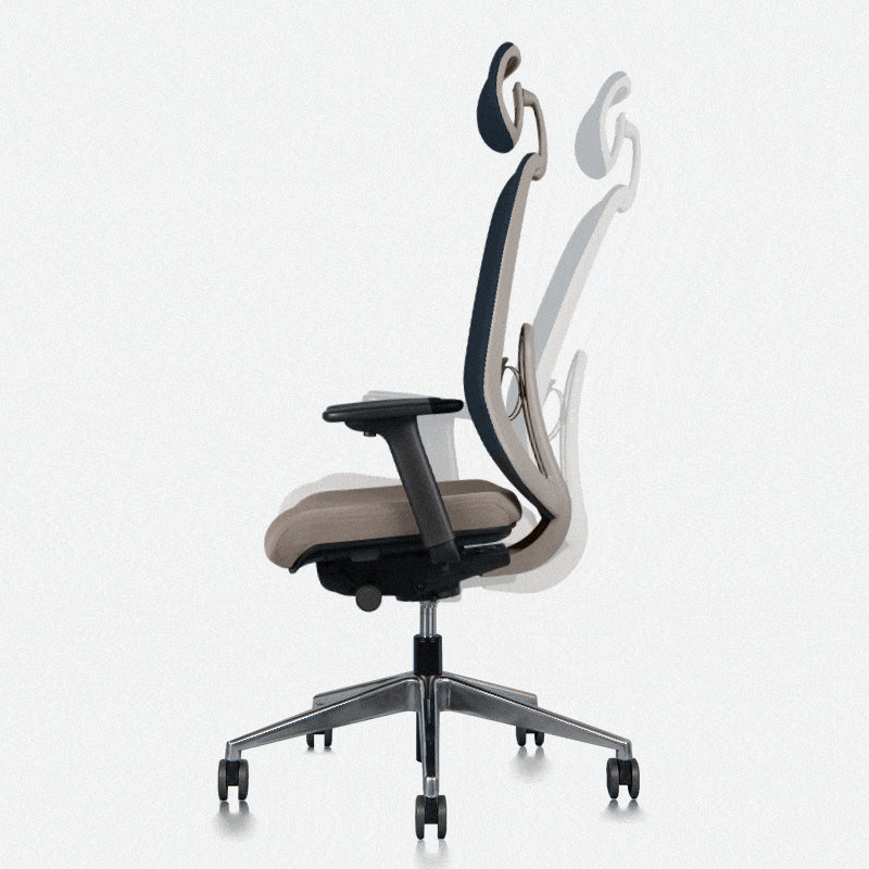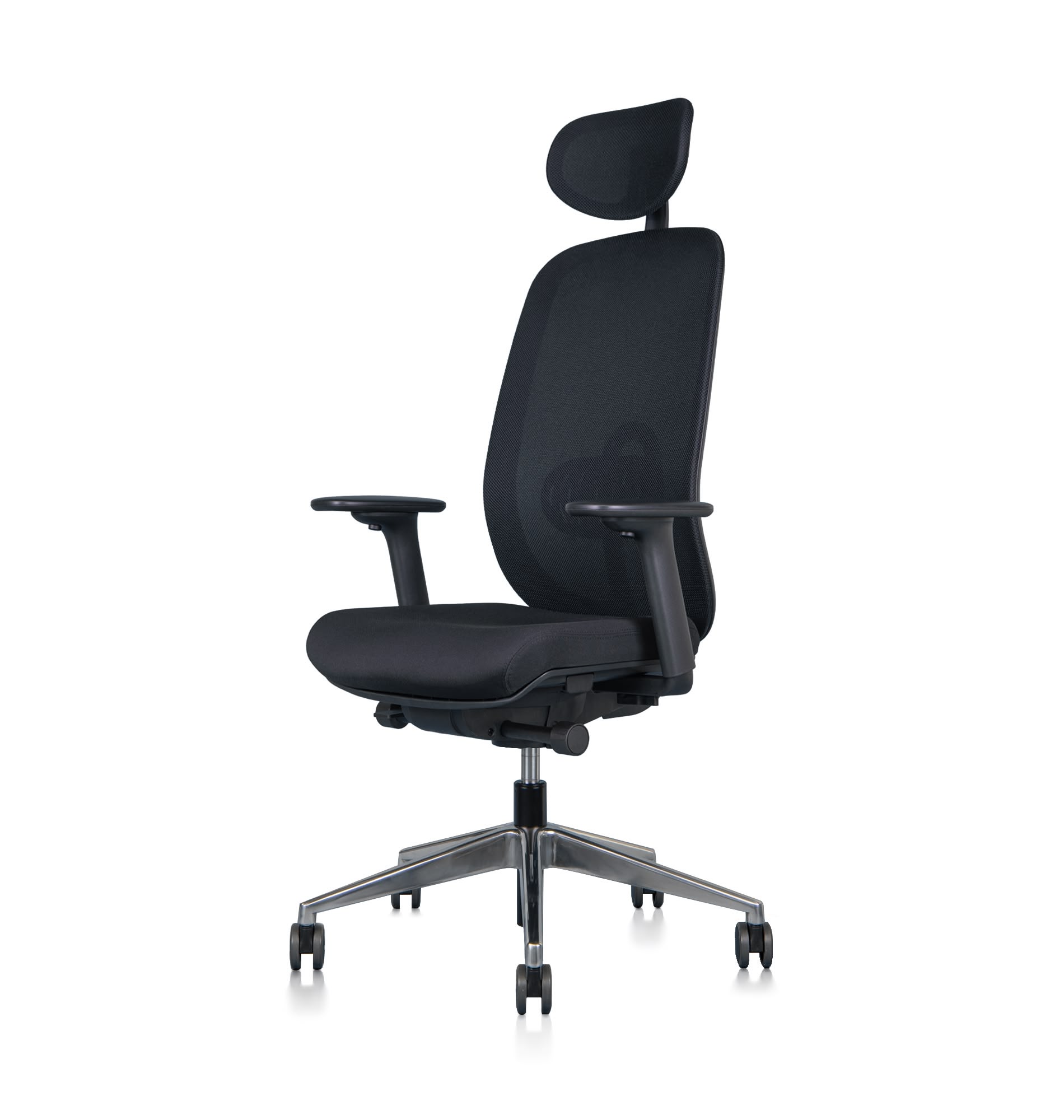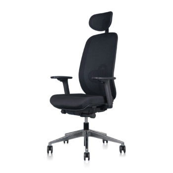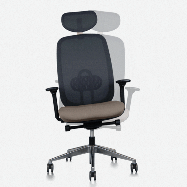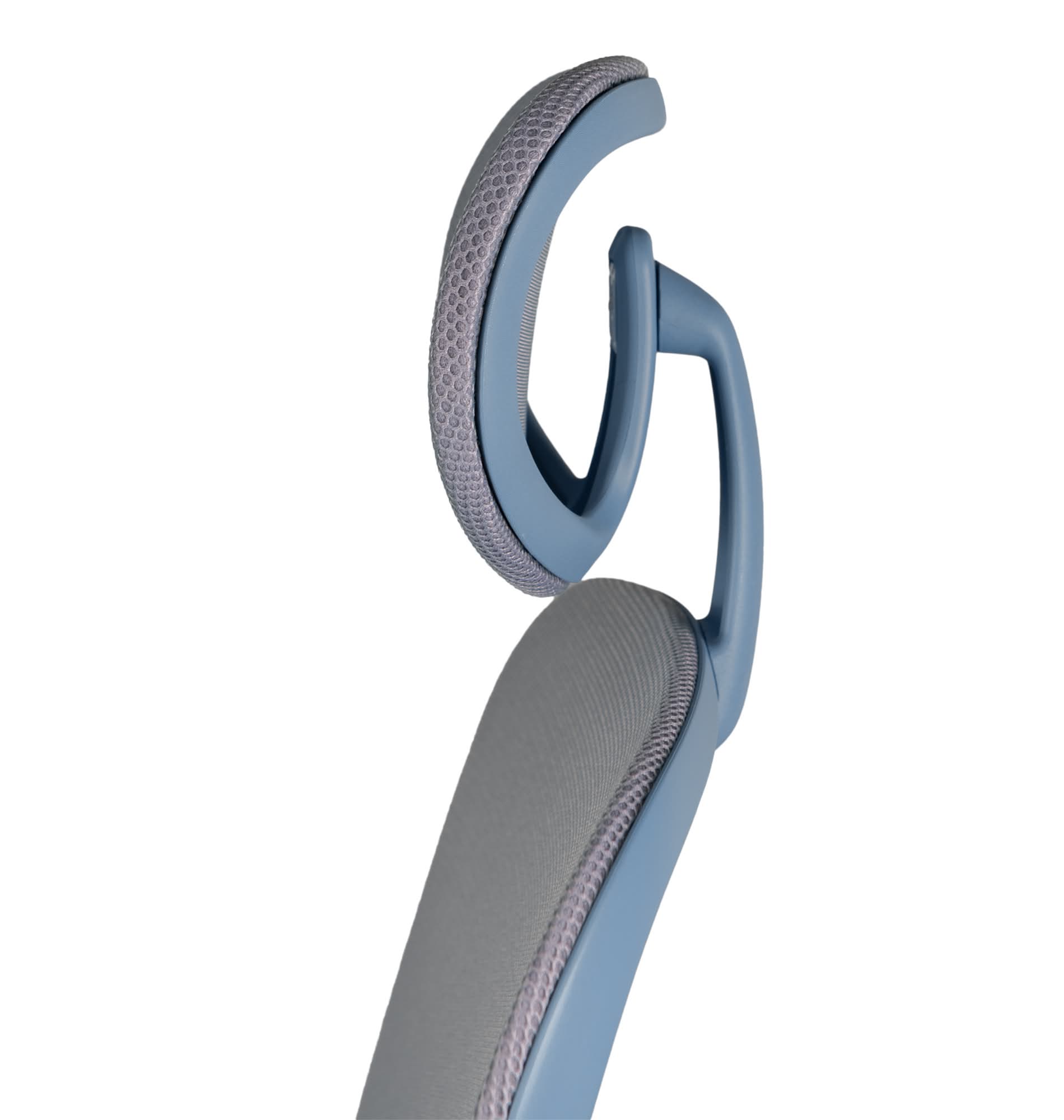 The backrest is crafted from breathable mesh with integrated lumbar support, providing optimal spinal support. The headrest is vertically rotatable and height-adjustable, offering additional neck support.