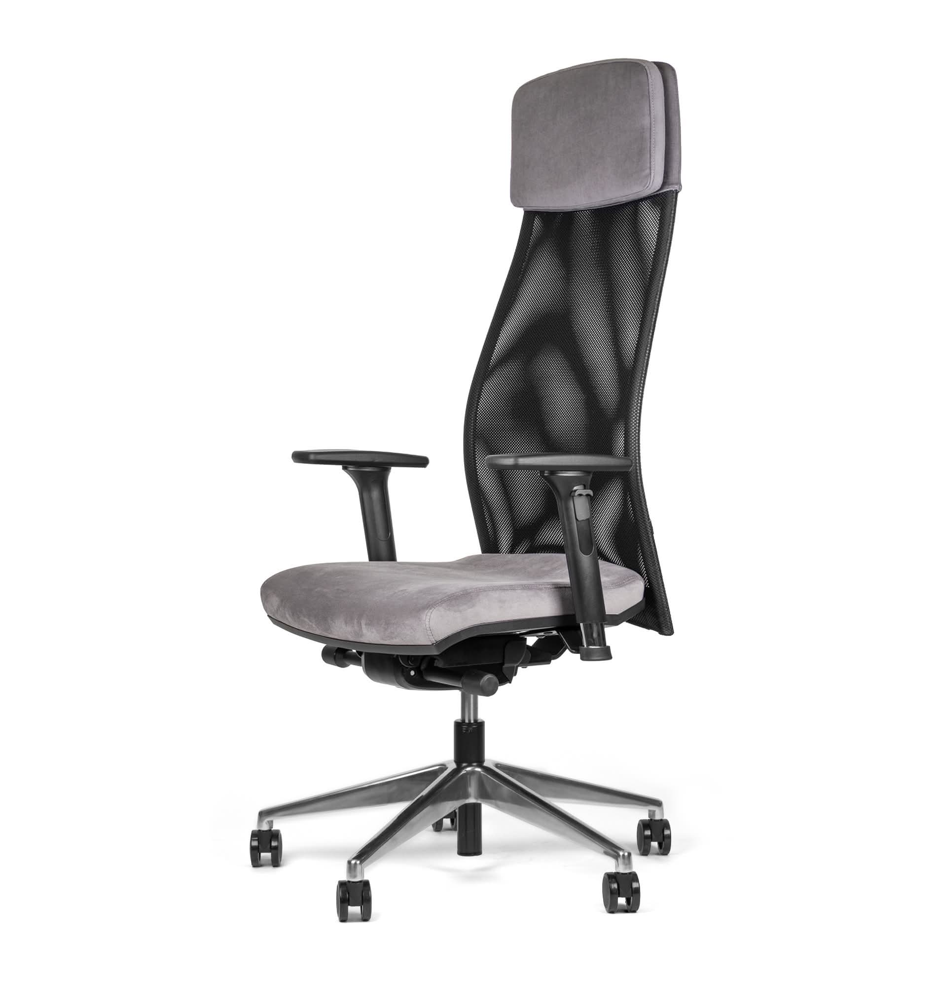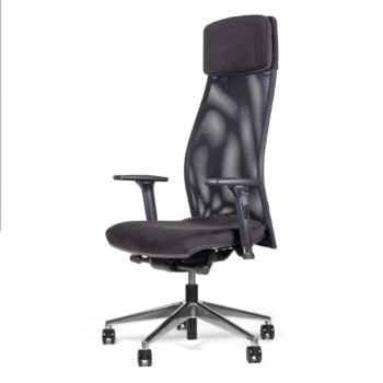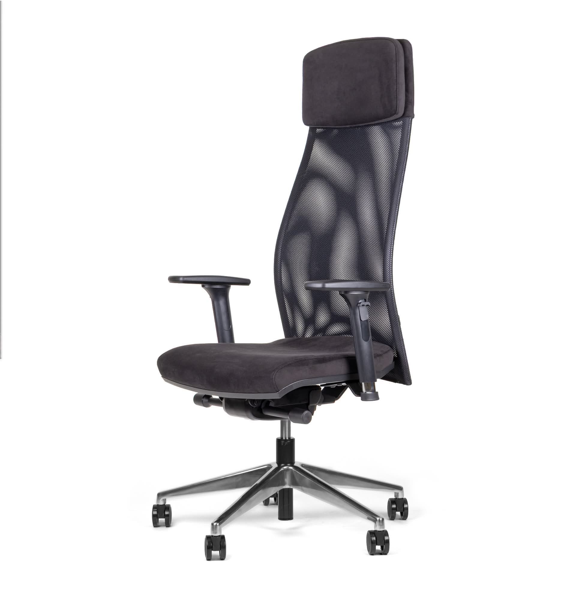 A high mid-range task chair with an ergonomically shaped seat, designed for extended daily use. Instead of a traditional headrest, it features an elevated backrest with an attached cushion upholstered in the same material as the seat.